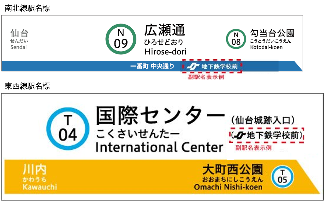 | 掲出場所: | (1)ホーム階駅名標等:施設の名称を「(副駅名施設)前」と表示 |