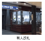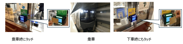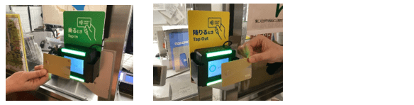 ・ 駅の有人改札に2か所の読取機があります。乗車する際は改札に入る手前側の読取機に、下車する際は改札を出る手前側の読取機にそれぞれクレジットカードをタッチしてください。 駅務員が同時に確認しゲートを開けます。