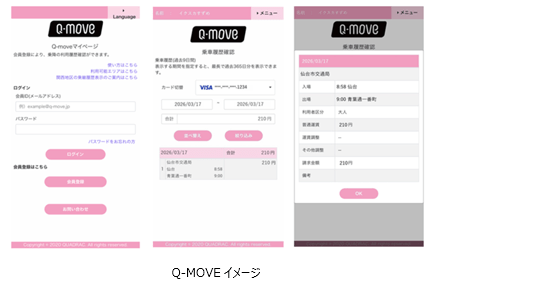 | A. | 利用履歴等については、QUADRAC社が提供するQ-moveサイト(https://q-move.info/start/)の「マイページ」から確認できます。 ※Q-moveサイトに接続する場合は通信料が別途かかります。 また、ご利用には会員登録手続きが必要です。 |