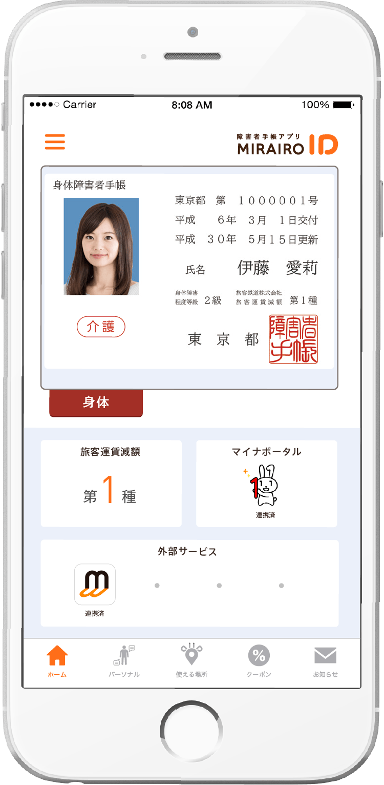 各種障害者手帳を「ミライロID」に搭載し、下記のように「マイナポータル」が”連携済み”と表示されている場合にご利用になれます。