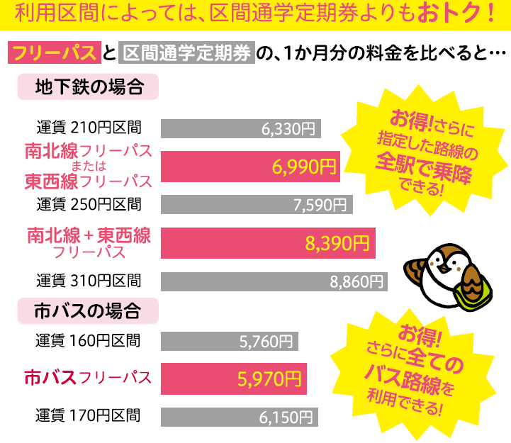 | 市バス・地下鉄フリーパス | 市バス+南北線 | 5,580円 | 16,740円 | 33,480円 |
