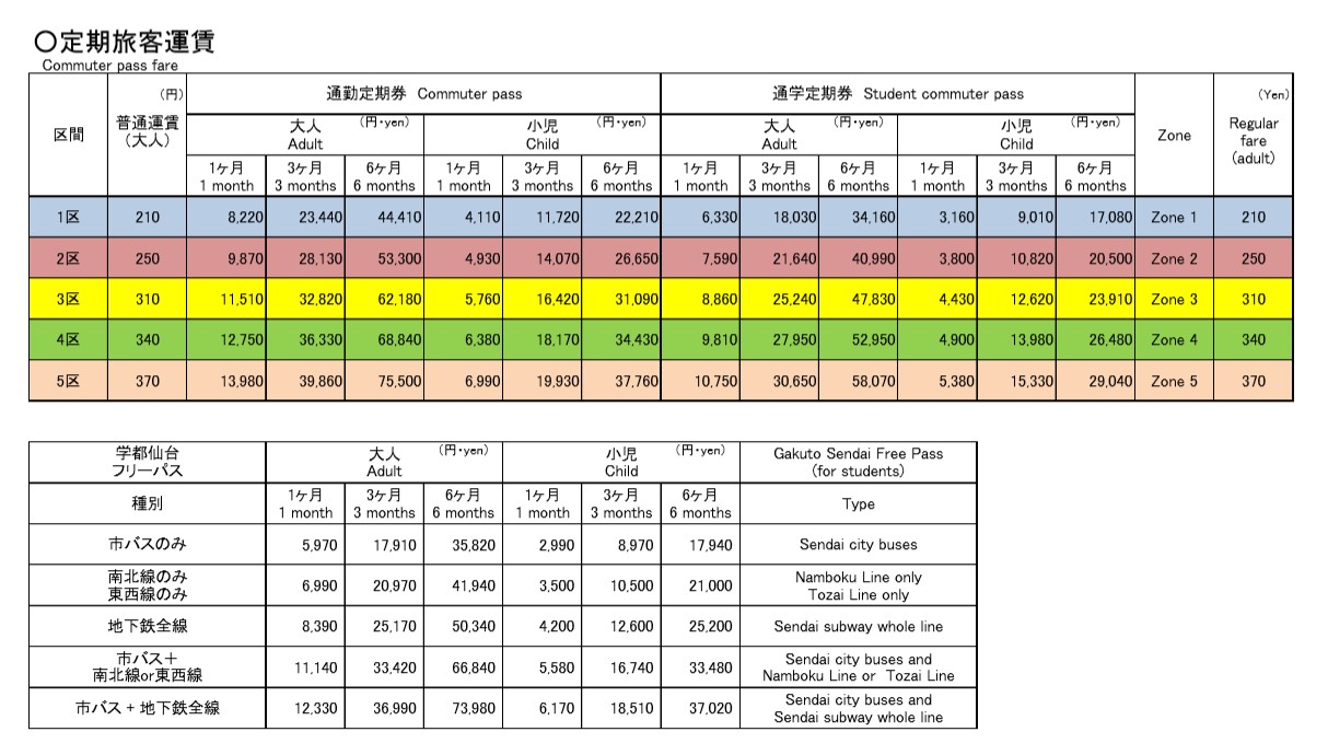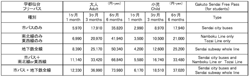 | 学都仙台フリーパス | 市バス全線、地下鉄南北線・東西線のうち指定した路線 | 学生・生徒・児童の方 市バスの全線や地下鉄の指定路線が乗り降り自由になる、便利でお得な通学定期券です。習い事やアルバイトのみの目的でも購入できます。 |