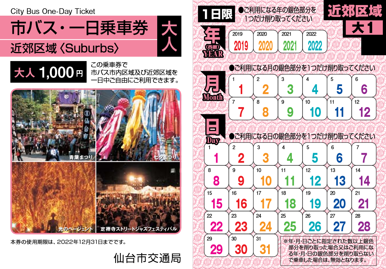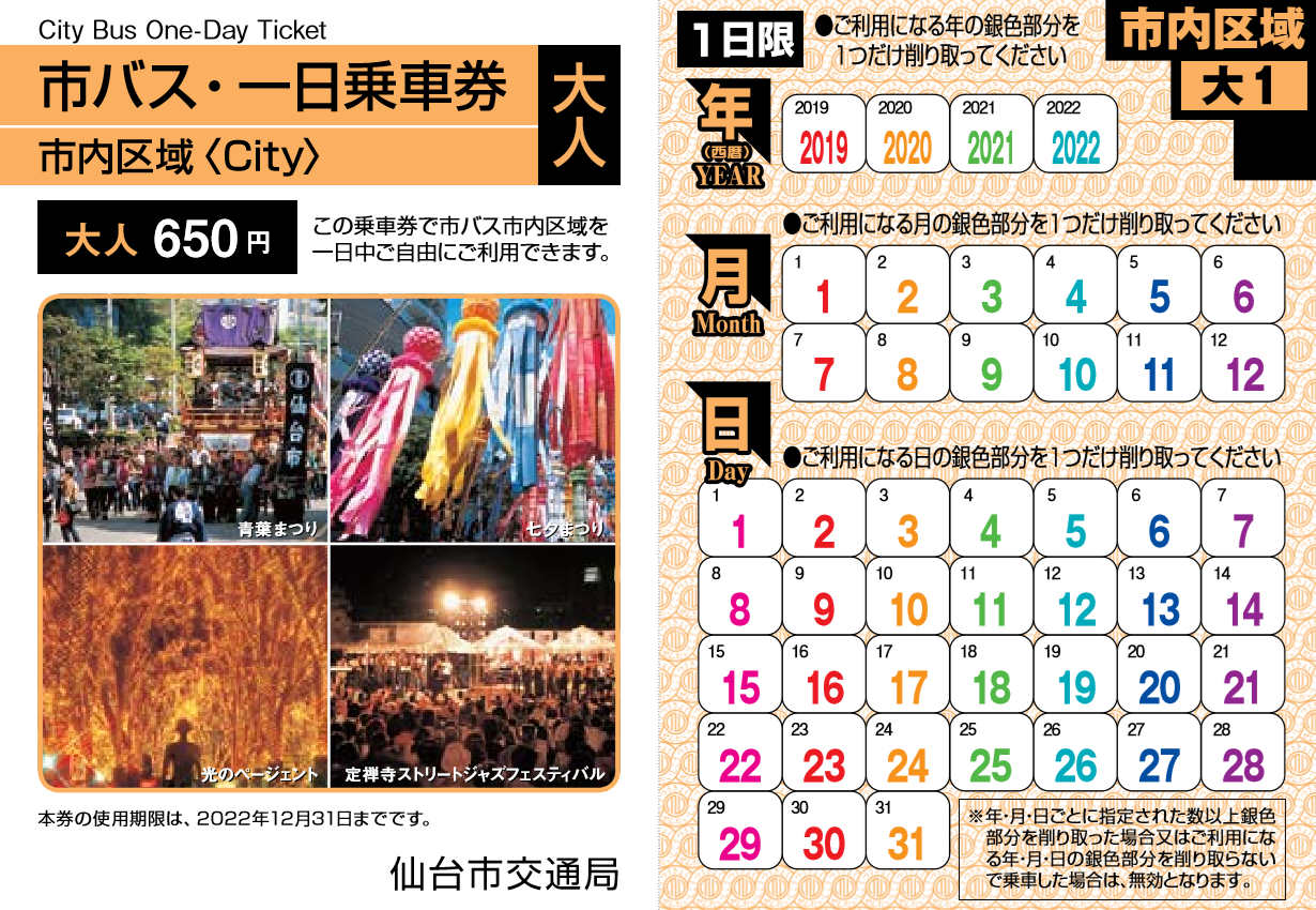 •市内区域券(仙台駅から260円区間内全線通用)