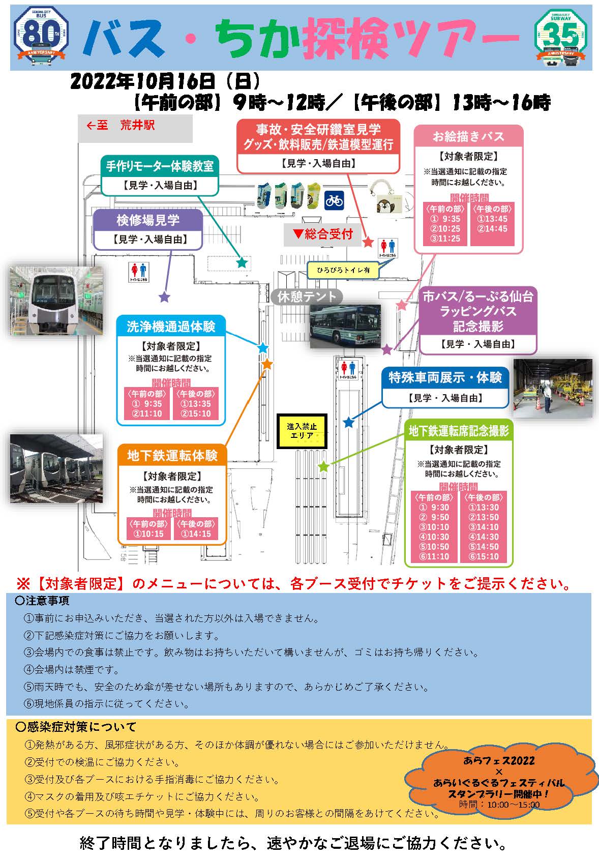 仙台市交通局では、平成29年度から荒井車両基地を一般開放する「バス・ちか祭り」を開催していますが、令和4年度は新型コロナウイルスの感染拡大防止のため、事前申込制1,000人限定で「バス・ちか探検ツアー」として開催しました。