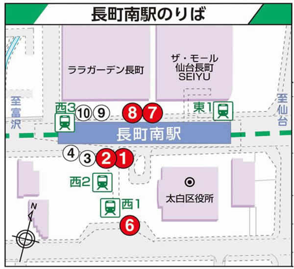 | 6 | 長町六丁目 | 南仙台駅・四郎丸 | 10,15 |